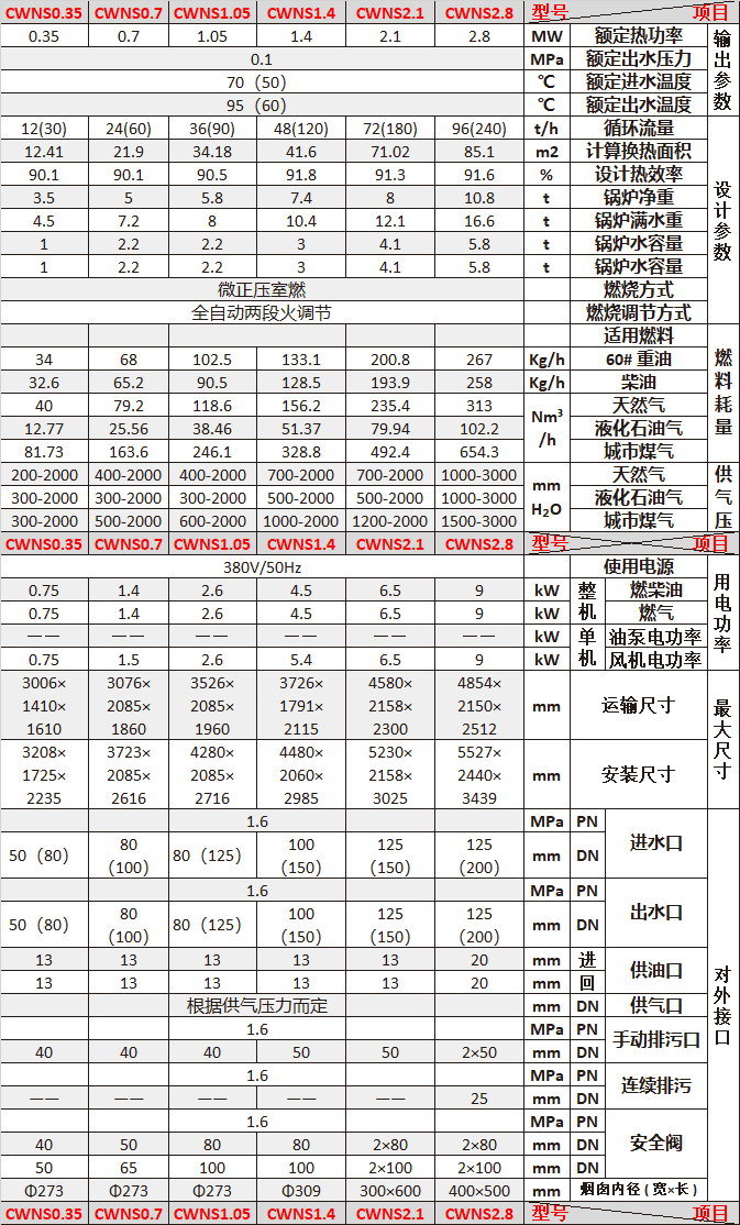 【注】 各種鍋爐都可以整裝出廠,但是由于體積和運輸?shù)脑颍话阏b鍋爐只限300萬大卡以下的鍋爐。